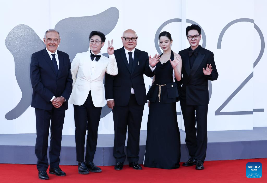VENECIA, 5 septiembre, 2025 (Xinhua) -- El director del Festival de Cine de Venecia, Alberto Barbera (i), y Cai Shangjun (3-i), director de la película "The Sun Rises On Us All", junto a los miembros del reparto de la película, Zhang Songwen (2-i), Xin Zhilei (2-d), y Feng Shaofeng, posan en la alfombra roja del estreno durante el 82º Festival de Cine de Venecia, en Venecia, Italia, el 5 de septiembre de 2025. (Xinhua/Li Jing)