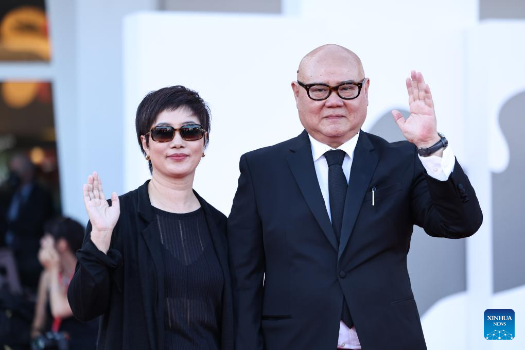 VENECIA, 5 septiembre, 2025 (Xinhua) -- Cai Shangjun (d), director de la película "The Sun Rises On Us All", posa en la alfombra roja del estreno durante el 82º Festival de Cine de Venecia, en Venecia, Italia, el 5 de septiembre de 2025. (Xinhua/Li Jing)