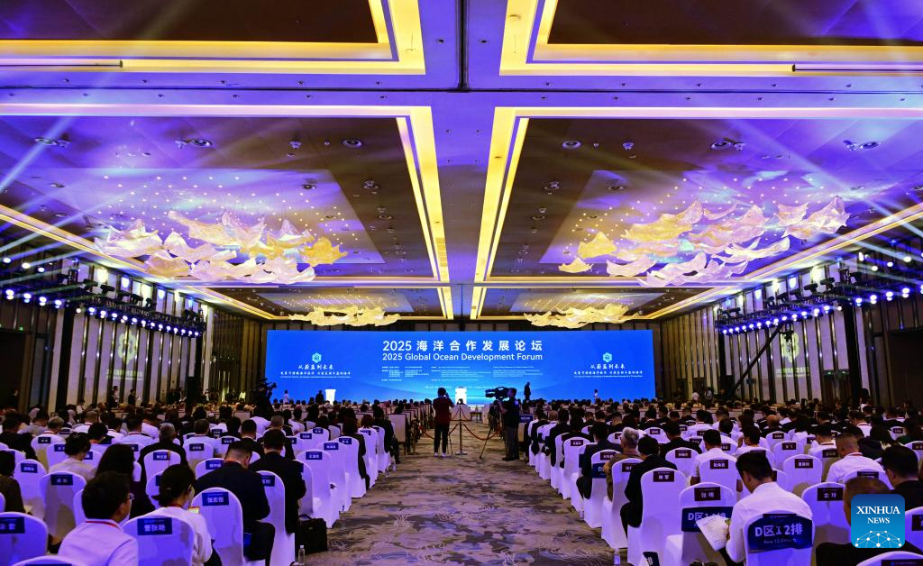 QINGDAO, 8 septiembre, 2025 (Xinhua) -- Imagen del 8 de septiembre de 2025 de una escena de la ceremonia de apertura del Foro Mundial para el Desarrollo de los Océanos, en Qingdao, en la provincia de Shandong, en el este de China. Con el tema "Aprovechemos nuestro futuro: Desarrollando una economía marina sostenible para un océano próspero", el Foro Mundial para el Desarrollo de los Océanos 2025 comenzó aquí el lunes. (Xinhua/Li Ziheng)