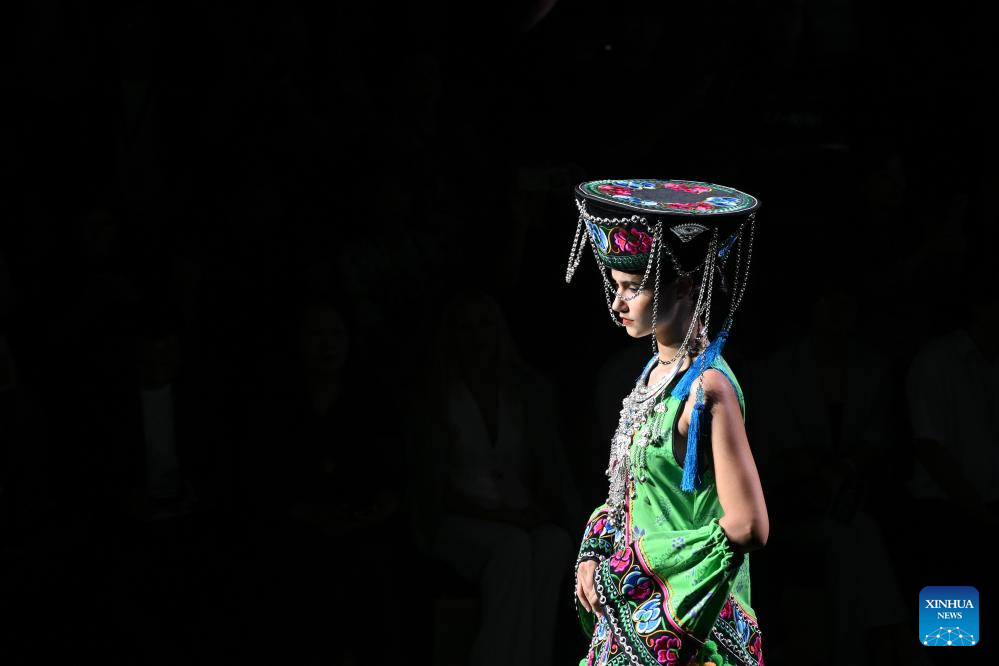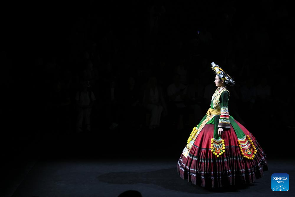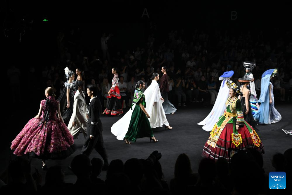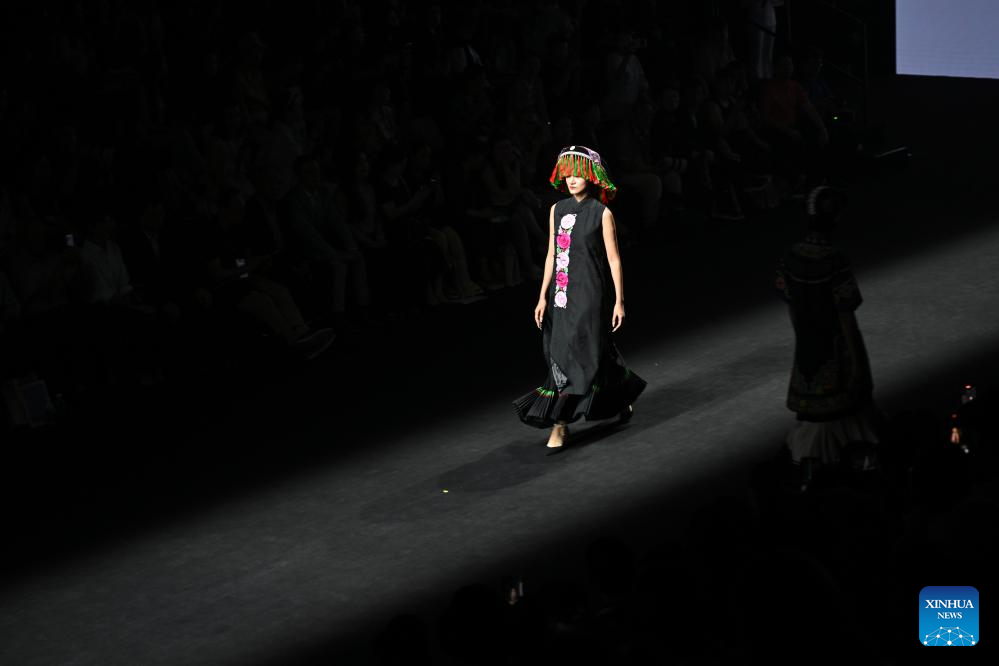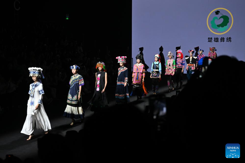 BEIJING, 8 septiembre, 2025 (Xinhua) -- Modelos presentan creaciones con bordados del grupo étnico yi de la prefectura autónoma de la etnia yi de Chuxiong de la provincia de Yunnan, durante la Semana de la Moda de China 2025 (Otoño), en Beijing, capital de China, el 8 de septiembre de 2025. (Xinhua/Jin Liangkuai)