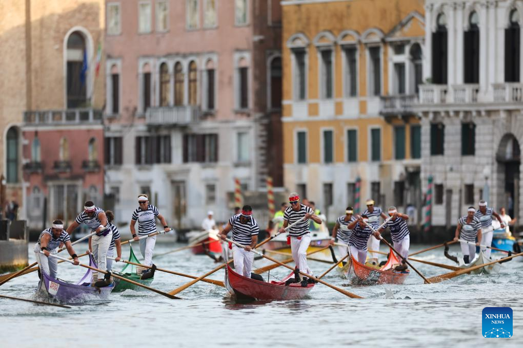 VENECIA, 8 septiembre, 2025 (Xinhua) -- Imagen del 7 de septiembre de 2025 de personas participando en la Regata Histórica, en Venecia, Italia. La Regata Histórica es un desfile anual de botes y una carrera de remo en el Gran Canal de Venecia. (Xinhua/Li Jing)