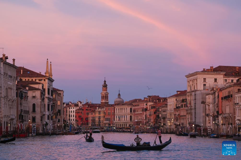 VENECIA, 8 septiembre, 2025 (Xinhua) -- Imagen del 7 de septiembre de 2025 de personas remando en botes al atardecer después de la Regata Histórica, en Venecia, Italia. La Regata Histórica es un desfile anual de botes y una carrera de remo en el Gran Canal de Venecia. (Xinhua/Li Jing)