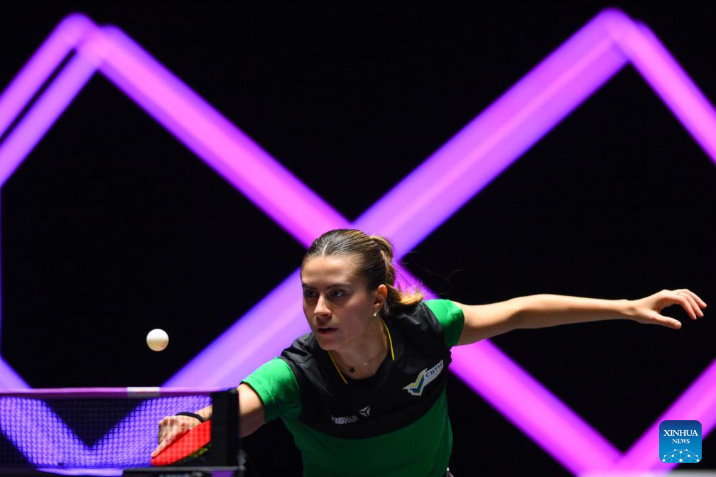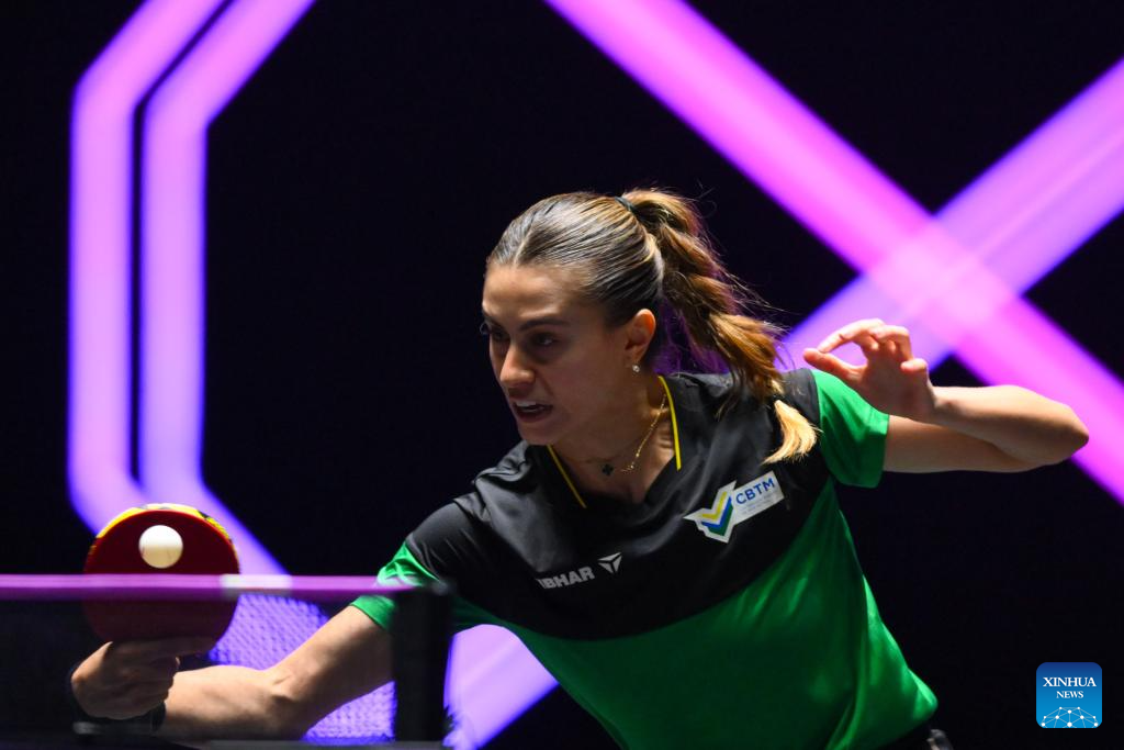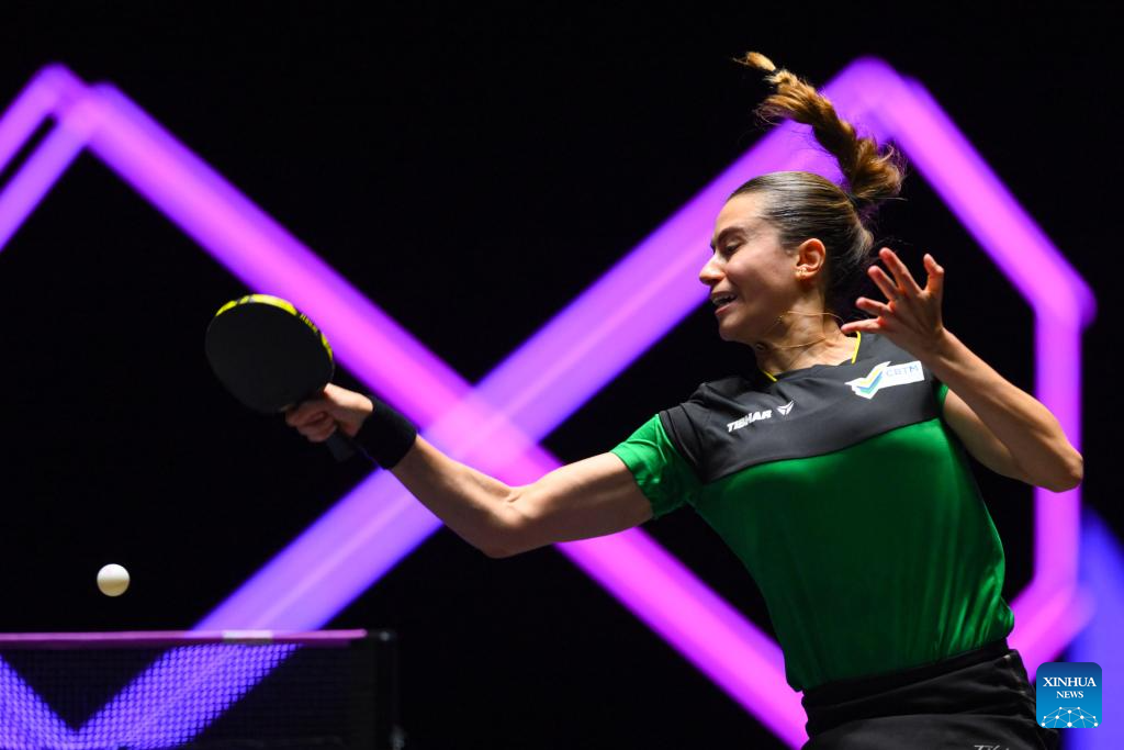 MACAO, 9 septiembre, 2025 (Xinhua) -- Bruna Takahashi, de Brasil, devuelve la pelota durante el partido de dieciseisavos de final de individuales femeninos ante Yuan Jianan, de Francia, en el Campeonato Mundial de Tenis de Mesa (WTT) 2025, en Macao, en el sur de China, el 9 de septiembre de 2025. (Xinhua/Cheong Kam Ka)