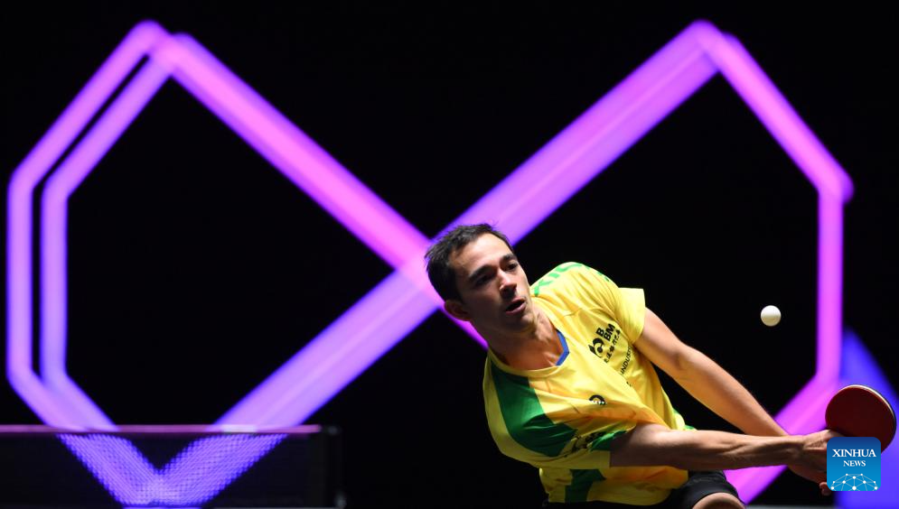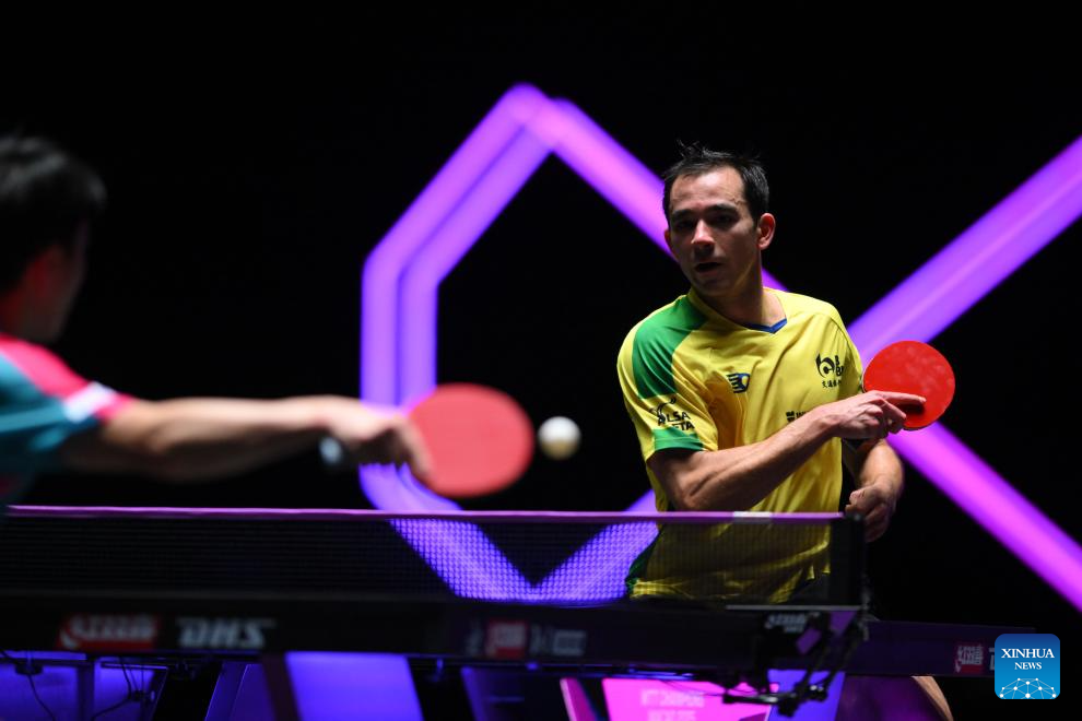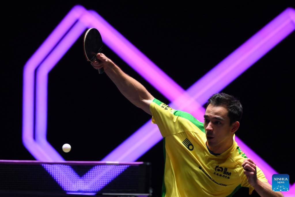 MACAO, 9 septiembre, 2025 (Xinhua) -- Hugo Calderano, de Brasil, devuelve la pelota durante el partido de dieciseisavos de final de individuales masculinos ante An Jaehyun, de República de Corea, en el Campeonato Mundial de Tenis de Mesa (WTT) 2025, en Macao, en el sur de China, el 9 de septiembre de 2025. (Xinhua/Cheong Kam Ka)