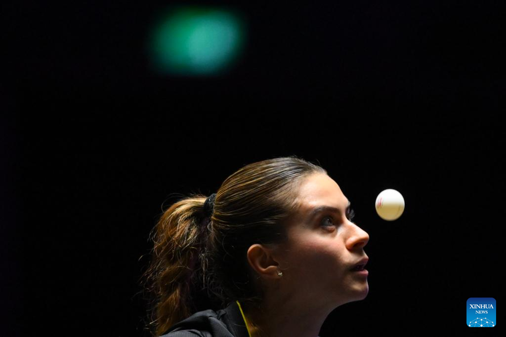MACAO, 9 septiembre, 2025 (Xinhua) -- Bruna Takahashi, de Brasil, sirve la pelota durante el partido de dieciseisavos de final de individuales femeninos ante Yuan Jianan, de Francia, en el Campeonato Mundial de Tenis de Mesa (WTT) 2025, en Macao, en el sur de China, el 9 de septiembre de 2025. (Xinhua/Cheong Kam Ka)