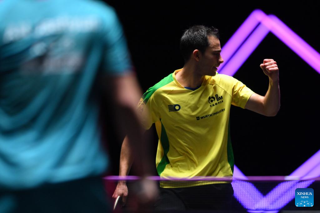 MACAO, 9 septiembre, 2025 (Xinhua) -- Hugo Calderano, de Brasil, festeja durante el partido de dieciseisavos de final de individuales masculinos ante An Jaehyun, de República de Corea, en el Campeonato Mundial de Tenis de Mesa (WTT) 2025, en Macao, en el sur de China, el 9 de septiembre de 2025. (Xinhua/Cheong Kam Ka)