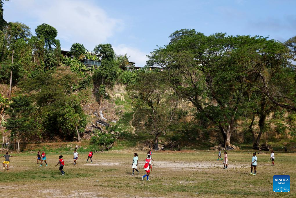 HONIARA, 12 septiembre, 2025 (Xinhua) -- Imagen del 9 de septiembre de 2025 de niñas jugando al fútbol en un patio de recreo, en un suburbio de Honiara, Islas Salomón. (Xinhua/Ma Ping)