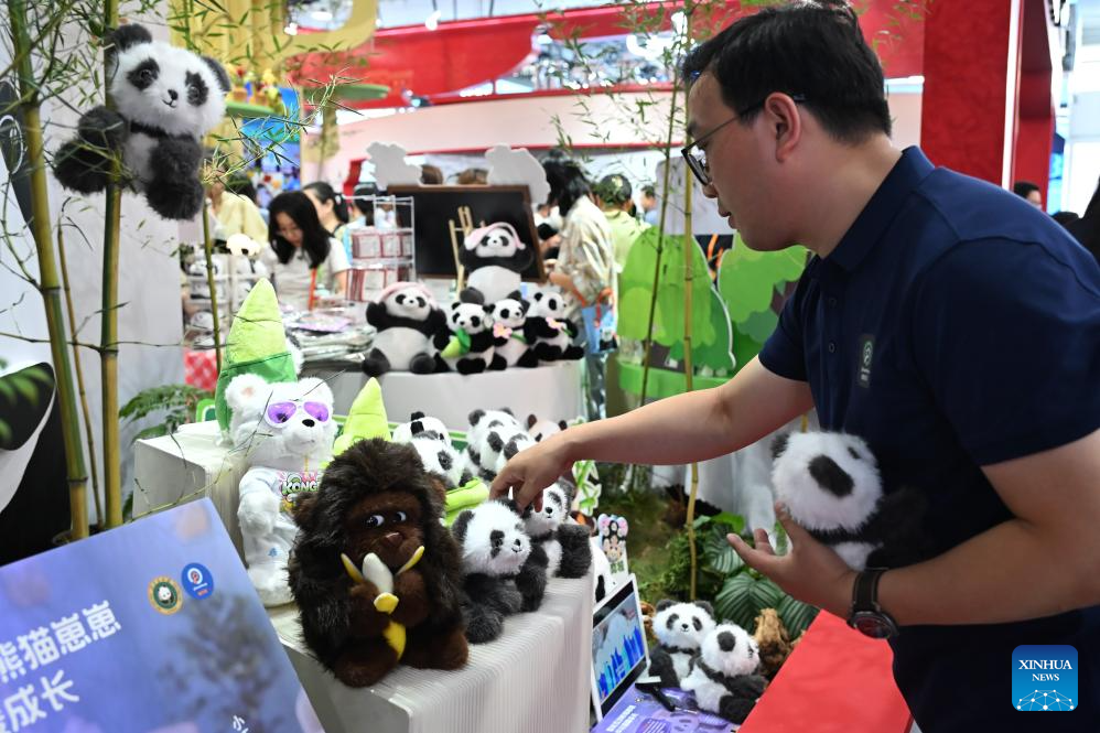 BEIJING, 12 septiembre, 2025 (Xinhua) -- Productos culturales y creativos con temática de panda son exhibidos en la Feria Internacional de Comercio de Servicios de China (CIFTIS, por sus siglas en inglés) 2025, en Beijing, capital de China, el 12 de septiembre de 2025. La CIFTIS 2025 se lleva a cabo del 10 al 14 de septiembre en el Parque Shougang en Beijing. La feria de este año presenta una amplia gama de productos culturales y creativos, muy populares entre los visitantes. (Xinhua/Liu Lingyi)