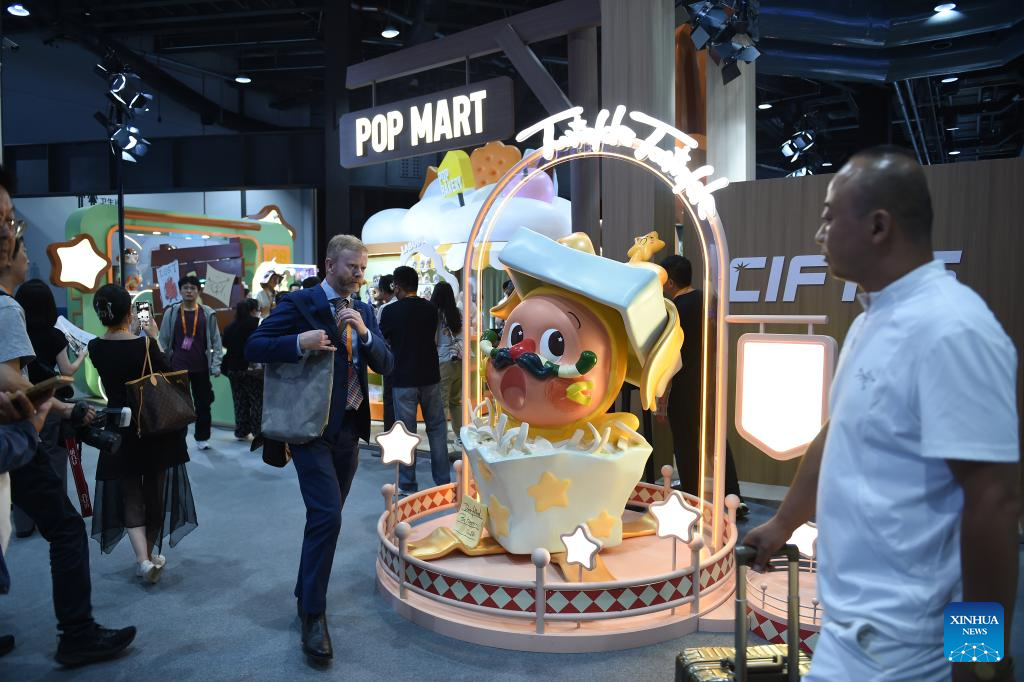 BEIJING, 12 septiembre, 2025 (Xinhua) -- Imagen del 10 de septiembre de 2025 de personas visitando el estand de Pop Mart exhibido en la Feria Internacional de Comercio de Servicios de China (CIFTIS, por sus siglas en inglés) 2025, en Beijing, capital de China. La CIFTIS 2025 se lleva a cabo del 10 al 14 de septiembre en el Parque Shougang en Beijing. La feria de este año presenta una amplia gama de productos culturales y creativos, muy populares entre los visitantes. (Xinhua/Liu Lingyi)