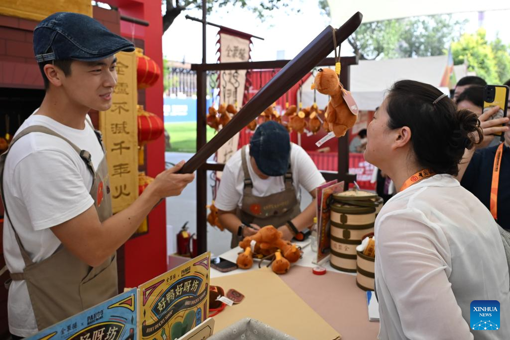 BEIJING, 12 septiembre, 2025 (Xinhua) -- Un expositor (i) presenta productos culturales y creativos de pato asado exhibidos en el estand de Quanjude, una marca consagrada por el pato de Peking, durante la Feria Internacional de Comercio de Servicios de China (CIFTIS, por sus siglas en inglés) 2025, en Beijing, capital de China, el 12 de septiembre de 2025. La CIFTIS 2025 se lleva a cabo del 10 al 14 de septiembre en el Parque Shougang en Beijing. La feria de este año presenta una amplia gama de productos culturales y creativos, muy populares entre los visitantes. (Xinhua/Sui Shangjun)