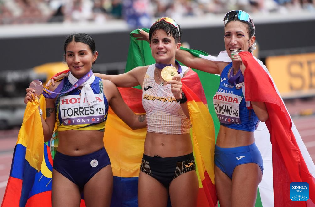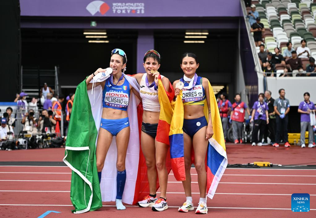 TOKIO, 13 septiembre, 2025 (Xinhua) -- La medallista de oro María Pérez (c), de España, la medallista de plata Antonella Palmisano (i), de Italia, y la medallista de bronce Paula Milena Torres, de Ecuador, posan al término de la final de 35 km de marcha femenina en el Campeonato Mundial de Atletismo 2025, en el Estadio Nacional, en Tokio, Japón, el 13 de septiembre de 2025. (Xinhua/Song Yanhua)