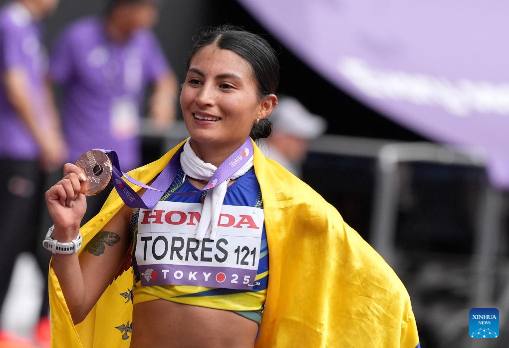 TOKIO, 13 septiembre, 2025 (Xinhua) -- La medallista de bronce Paula Milena Torres, de Ecuador, posa con su medalla al término de la final de 35 km de marcha femenina en el Campeonato Mundial de Atletismo 2025, en el Estadio Nacional, en Tokio, Japón, el 13 de septiembre de 2025. (Xinhua/Song Yanhua)