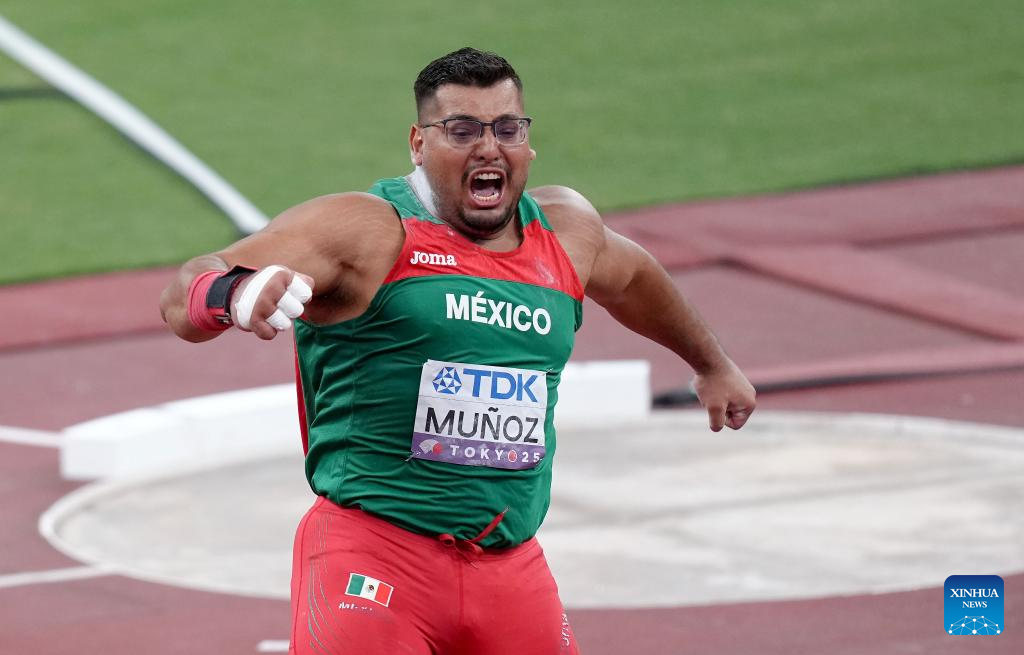 TOKIO, 13 septiembre, 2025 (Xinhua) -- Uziel Muñoz, de México, festeja durante la final de lanzamiento de peso masculino en el Campeonato Mundial de Atletismo 2025, en Tokio, Japón, el 13 de septiembre de 2025. (Xinhua/Ju Huanzong)