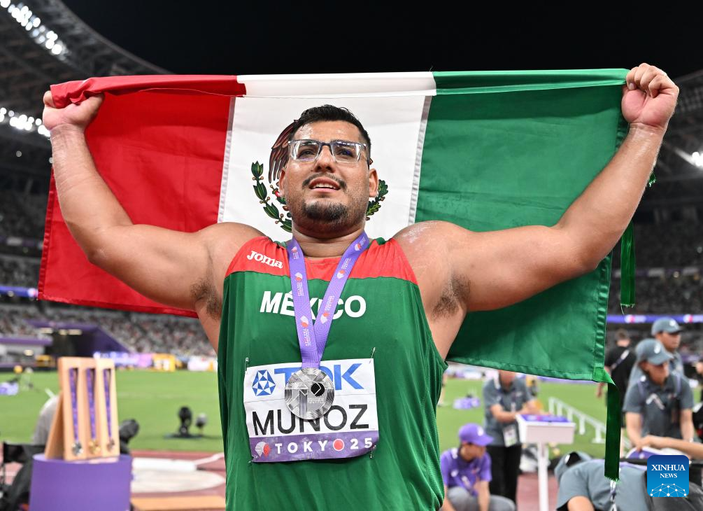 TOKIO, 13 septiembre, 2025 (Xinhua) -- El medallista de plata Uziel Muñoz (i), de México, festeja al término de la final de lanzamiento de peso masculino en el Campeonato Mundial de Atletismo 2025, en Tokio, Japón, el 13 de septiembre de 2025. (Xinhua/Song Yanhua)