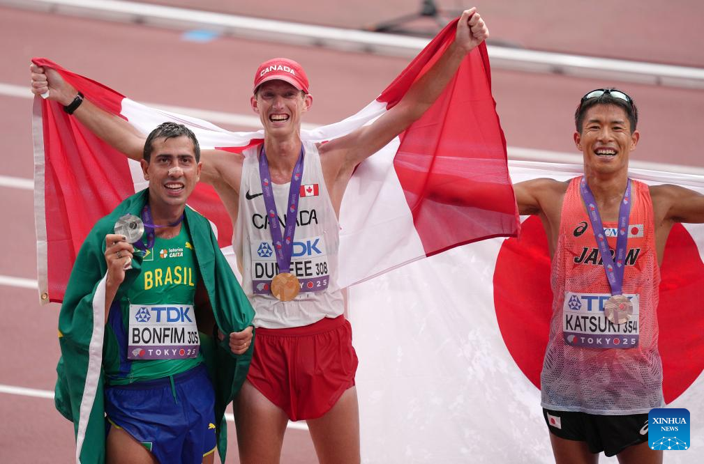 TOKIO, 13 septiembre, 2025 (Xinhua) -- El medallista de oro Evan Dunfee (c), de Canadá, el medallista de plata Caio Bonfim (i), de Brasil, y el medallista de bronce Katsuki Hayato, de Japón, festejan al término de la final de 35 km de marcha masculina en el Campeonato Mundial de Atletismo 2025, en el Estadio Nacional, en Tokio, Japón, el 13 de septiembre de 2025. (Xinhua/Ju Huanzong)