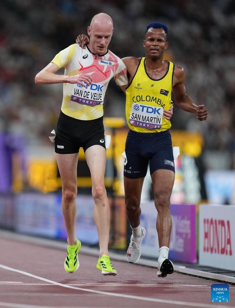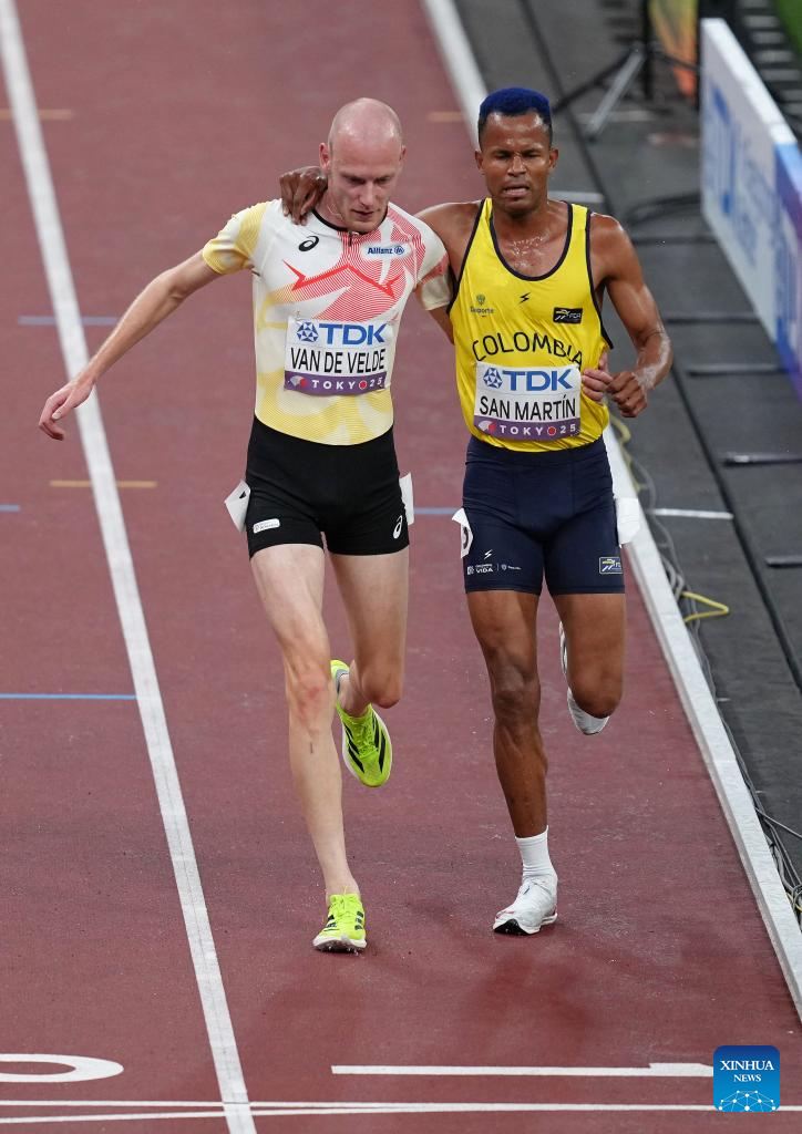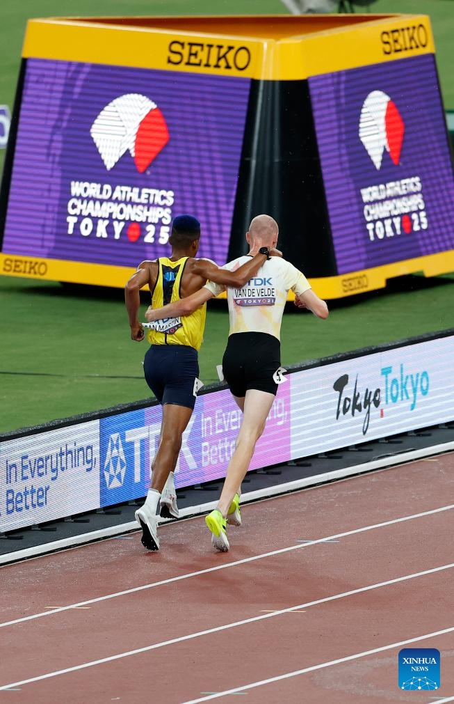TOKIO, 13 septiembre, 2025 (Xinhua) -- Tim Van de Velde (i), de Bélgica, ayuda a Carlos San Martín, de Colombia, durante las eliminatorias de 3000 m obstáculos masculinos en el Campeonato Mundial de Atletismo 2025, en Tokio, Japón, el 13 de septiembre de 2025. (Xinhua/Lui Siu Wai)