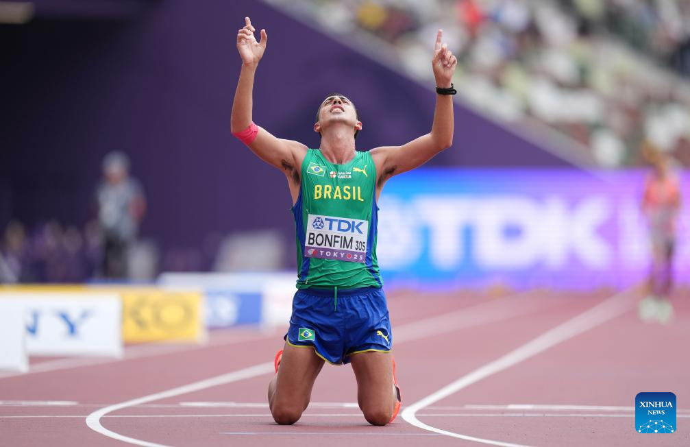 TOKIO, 13 septiembre, 2025 (Xinhua) -- El medallista de plata Caio Bonfim, de Brasil, festeja al término de la final de 35 km de marcha masculina en el Campeonato Mundial de Atletismo 2025, en el Estadio Nacional, en Tokio, Japón, el 13 de septiembre de 2025. (Xinhua/Lui Siu Wai)