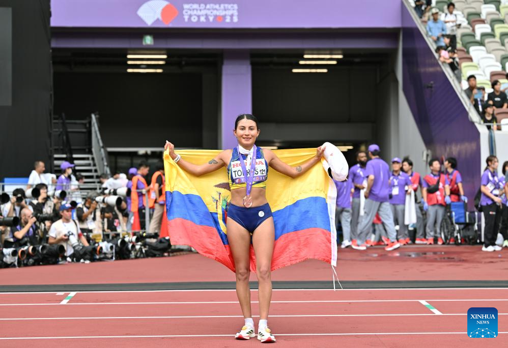 TOKIO, 13 septiembre, 2025 (Xinhua) -- La medallista de bronce Paula Milena Torres, de Ecuador, festeja con su medalla al término de la final de 35 km de marcha femenina en el Campeonato Mundial de Atletismo 2025, en el Estadio Nacional, en Tokio, Japón, el 13 de septiembre de 2025. (Xinhua/Li Gang)