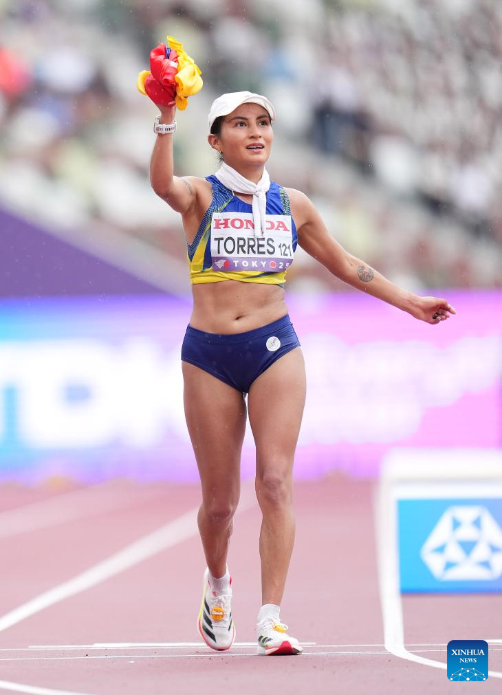 TOKIO, 13 septiembre, 2025 (Xinhua) -- La medallista de bronce Paula Milena Torres, de Ecuador, festeja al término de la final de 35 km de marcha femenina en el Campeonato Mundial de Atletismo 2025, en el Estadio Nacional, en Tokio, Japón, el 13 de septiembre de 2025. (Xinhua/Lui Siu Wai)