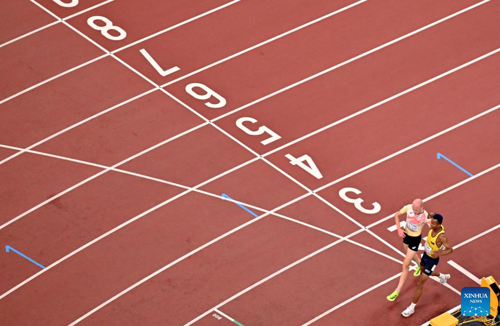 TOKIO, 13 septiembre, 2025 (Xinhua) -- Tim Van de Velde (i), de Bélgica, ayuda a Carlos San Martín, de Colombia, durante las eliminatorias de 3000 m obstáculos masculinos en el Campeonato Mundial de Atletismo 2025, en Tokio, Japón, el 13 de septiembre de 2025. (Xinhua/Li Ming)