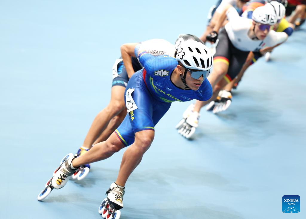 QINHUANGDAO, 13 septiembre, 2025 (Xinhua) -- Diego Molina (frente), de Colombia, compite durante la ronda 1 de la semifinal masculina junior por puntos de 5000 m en el Campeonato Mundial de Patinaje de Velocidad 2025, en el distrito de Beidaihe de Qinhuangdao, en la provincia de Hebei, en el norte de China, el 13 de septiembre de 2025. (Xinhua/Yang Shiyao)