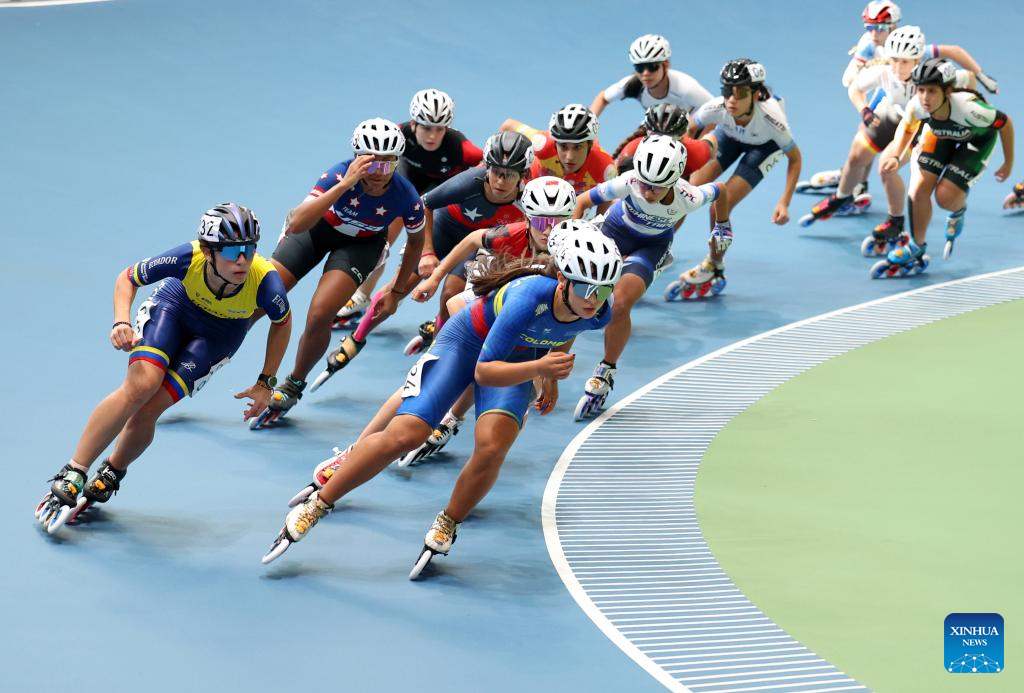QINHUANGDAO, 13 septiembre, 2025 (Xinhua) -- Manuela Rodríguez Torres (d-frente), de Colombia, compite durante la ronda 1 de la semifinal femenina junior por puntos de 5000 m en el Campeonato Mundial de Patinaje de Velocidad 2025, en el distrito de Beidaihe de Qinhuangdao, en la provincia de Hebei, en el norte de China, el 13 de septiembre de 2025. (Xinhua/Yang Shiyao)