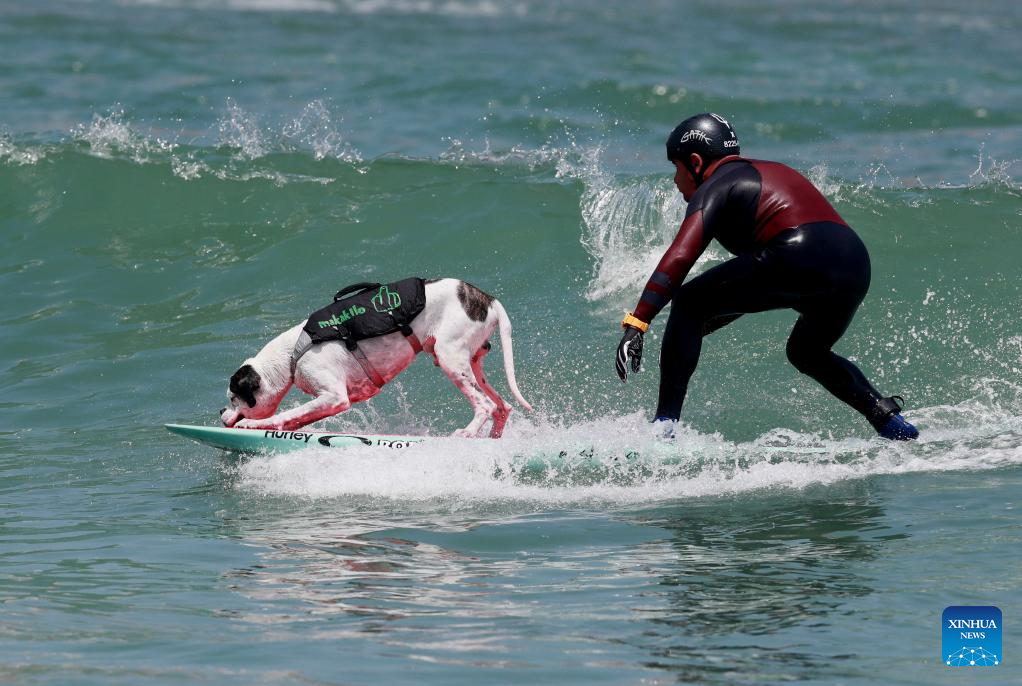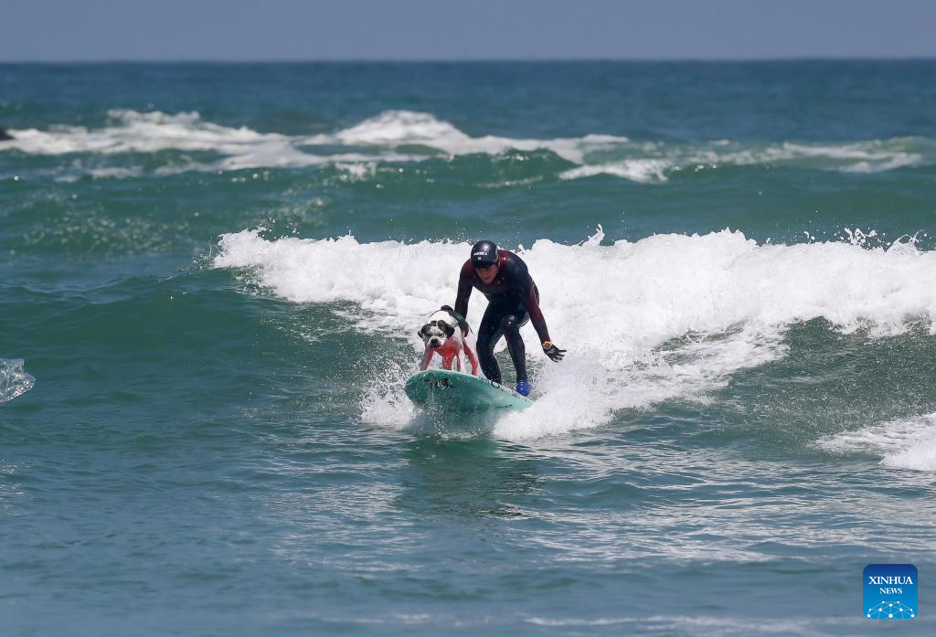 LIMA, 13 septiembre, 2025 (Xinhua) -- Domingo Pianezzi surfea con su perro Makakilo en la playa San Bartolo, en el sur de Lima, Perú, el 13 de septiembre de 2025. (Xinhua/Mariana Bazo)