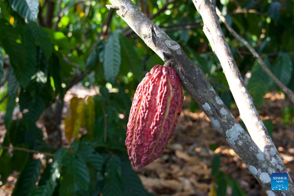 PARA, 11 septiembre, 2025 (Xinhua) -- Imagen del 9 de septiembre de 2025 de los frutos del cacao en el árbol en un vivero de árboles de cacao, en Brasil Novo, estado de Pará, Brasil. Ubicado en el norte de Brasil, el estado de Pará es la mayor área productora de cacao de Brasil, con una producción anual de aproximadamente 150.000 toneladas de cacao en grano, de las cuales el 95 por ciento es exportado. (Xinhua/Zhou Yongsui)