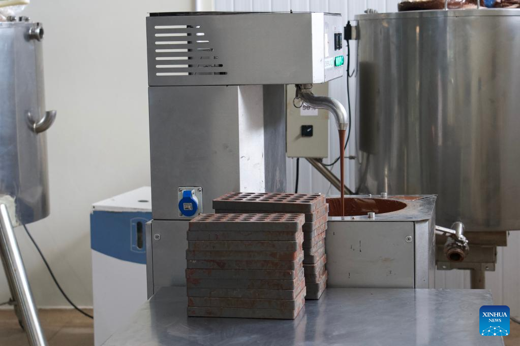 PARA, 11 septiembre, 2025 (Xinhua) -- Imagen del 10 de septiembre de 2025 de una máquina produciendo licor de cacao en una fábrica de chocolate, en Medicilandia, estado de Pará, Brasil. Ubicado en el norte de Brasil, el estado de Pará es la mayor área productora de cacao de Brasil, con una producción anual de aproximadamente 150.000 toneladas de cacao en grano, de las cuales el 95 por ciento es exportado. (Xinhua/Zhou Yongsui)