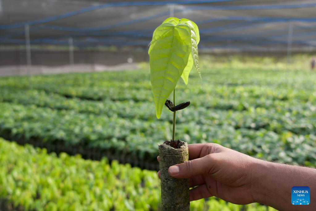 PARA, 11 septiembre, 2025 (Xinhua) -- Imagen del 9 de septiembre de 2025 de un agricultor mostrando brotes de cacao en un vivero de árboles de cacao, en Brasil Novo, estado de Pará, Brasil. Ubicado en el norte de Brasil, el estado de Pará es la mayor área productora de cacao de Brasil, con una producción anual de aproximadamente 150.000 toneladas de cacao en grano, de las cuales el 95 por ciento es exportado. (Xinhua/Zhou Yongsui)