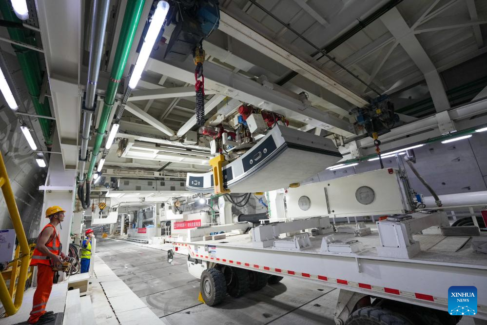 JINAN, 13 septiembre, 2025 (Xinhua) -- Imagen del 12 de septiembre de 2025 del sitio de construcción de un túnel del río Amarillo, en Jinan, en la provincia de Shandong, en el este de China. Con un diámetro de excavación de 15,06 metros, una máquina de escudo ha perforado 1.626 metros en la línea sur del túnel del río Amarillo en Jinan hasta el viernes. El túnel del río Amarillo tiene una longitud total de 3.888 metros, de los cuales 3.252 metros serán excavados con una máquina de escudo. Está diseñado como una autopista bidireccional de seis carriles con un límite de velocidad de 60 kilómetros por hora. (Xinhua/Xu Suhui)