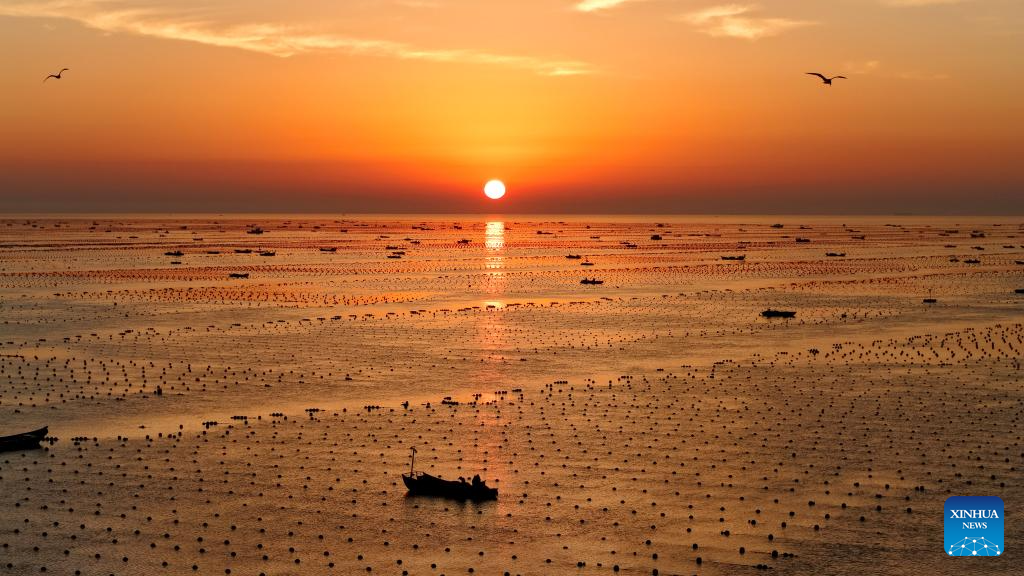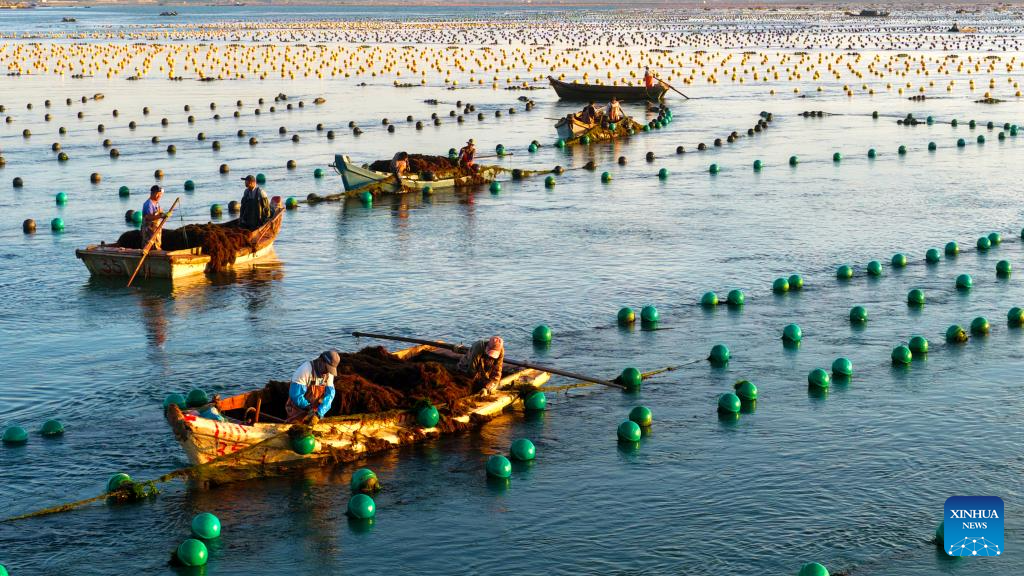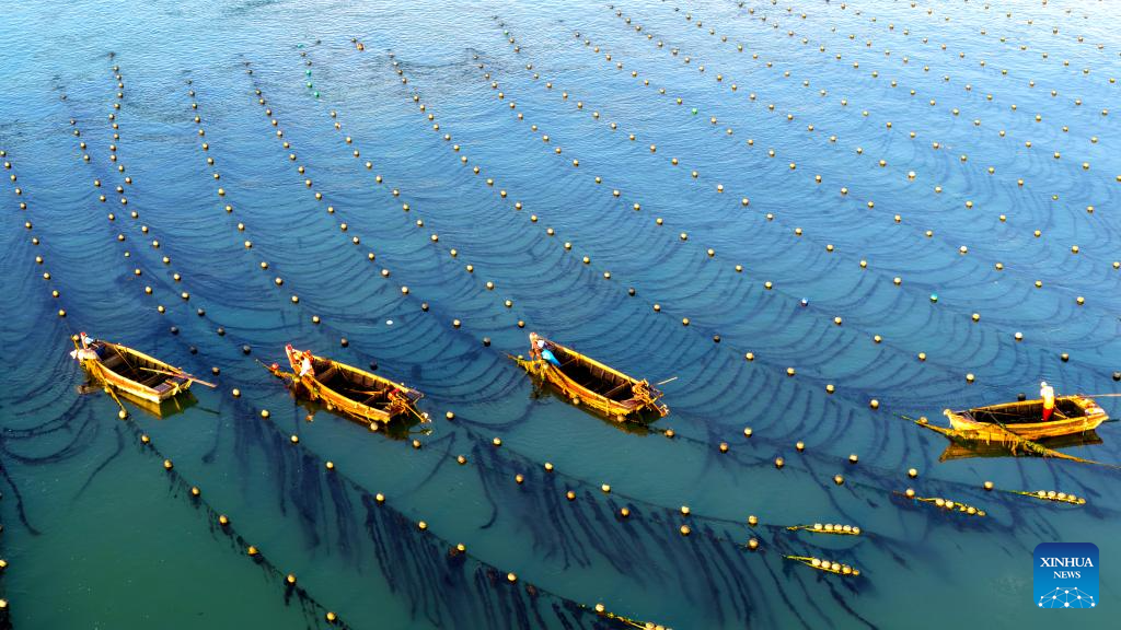 RONGCHENG, 11 septiembre, 2025 (Xinhua) -- Vista aérea tomada con un dron el 11 de septiembre de 2025 de pescadores trabajando a bordo de sus botes en una pastura marina, en Rongcheng, en la provincia de Shandong, en el este de China. (Xinhua/Yang Zhili)
