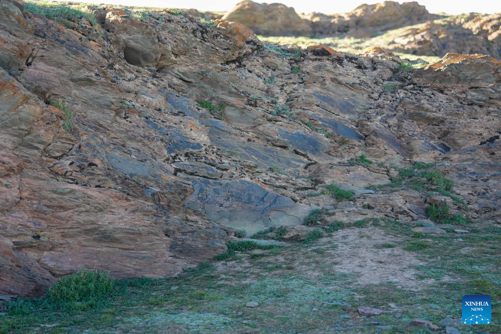 QINGHAI, 15 septiembre, 2025 (Xinhua) -- Imagen del 25 de julio de 2025 de la piedra grabada de la dinastía Qin descubierta en la costa norte del lago Gyaring, en el distrito de Maduo, en la provincia de Qinghai, en el noroeste de China. La Administración Nacional de Patrimonio Cultural de China anunció el lunes que una piedra grabada, descubierta en la meseta Qinghai-Tíbet, es la única piedra grabada de la dinastía Qin (221-207 a.C.) que aún se conserva en su sitio original y la que se ubica a mayor altitud dentro del período histórico. (Xinhua/Du Xiaowei)