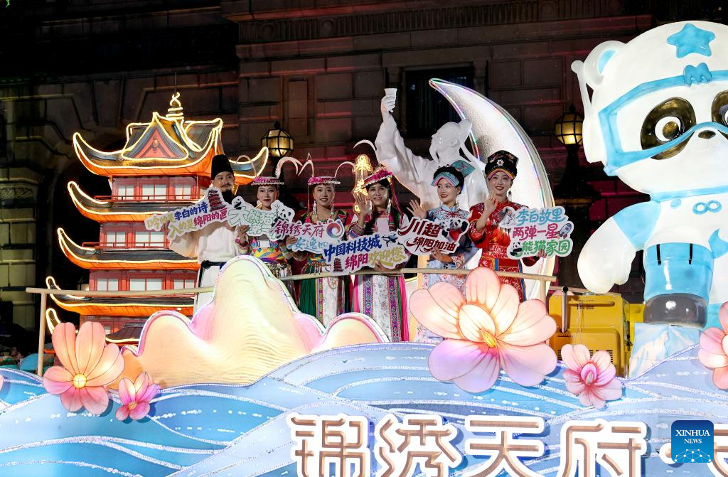 SHANGHAI, 14 septiembre, 2025 (Xinhua) -- Imagen del 13 de septiembre de 2025 de una carroza temática de la ciudad de Mianyang, en la provincia de Sichuan participando en un desfile durante el Festival de Turismo de Shanghai, en Shanghai, en el este de China. La ceremonia de inauguración del 36 desfile de carrozas del Festival de Turismo de Shanghai se celebró el sábado en el distrito de Huangpu de Shanghai. Un total de 25 carrozas y 24 equipos artísticos de 15 países y regiones participaron en el desfile. (Xinhua/Fang Zhe)