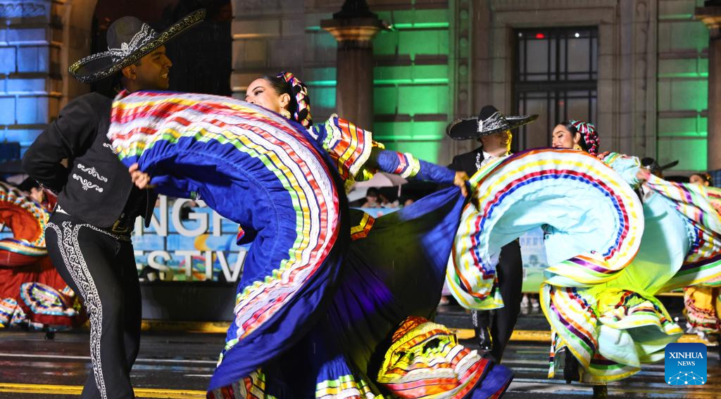 SHANGHAI, 14 septiembre, 2025 (Xinhua) -- Imagen del 13 de septiembre de 2025 de bailarines de México realizando una presentación durante el desfile de carrozas del Festival de Turismo de Shanghai, en Shanghai, en el este de China. La ceremonia de inauguración del 36 desfile de carrozas del Festival de Turismo de Shanghai se celebró el sábado en el distrito de Huangpu de Shanghai. Un total de 25 carrozas y 24 equipos artísticos de 15 países y regiones participaron en el desfile. (Xinhua/Fang Zhe)