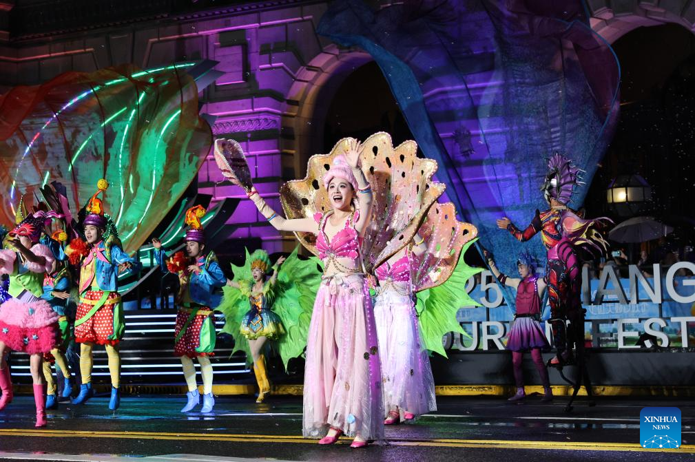 SHANGHAI, 14 septiembre, 2025 (Xinhua) -- Imagen del 13 de septiembre de 2025 de una compañía artística del Parque Oceánico Haichang de Shanghai realizando una presentación durante el desfile de carrozas del Festival de Turismo de Shanghai, en Shanghai, en el este de China. La ceremonia de inauguración del 36 desfile de carrozas del Festival de Turismo de Shanghai se celebró el sábado en el distrito de Huangpu de Shanghai. Un total de 25 carrozas y 24 equipos artísticos de 15 países y regiones participaron en el desfile. (Xinhua/Fang Zhe)