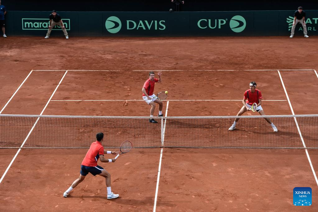 SANTIAGO, 15 septiembre, 2025 (Xinhua) -- Imagen del 14 de septiembre de 2025 de Raphel Calzi (c-arriba), de Luxemburgo, compitiendo durante el partido de dobles correspondiente a las eliminatorias de la Copa Davis ante Alex Knaff y Raphel Calzi, de Luxemburgo, celebrado en el Court Central Anita Lizana del Estadio Nacional de Chile, en Santiago, capital de Chile. (Xinhua/Jorge Villegas)