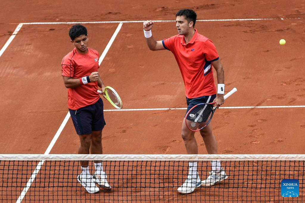 SANTIAGO, 15 septiembre, 2025 (Xinhua) -- Imagen del 14 de septiembre de 2025 de Matías Soto (i) y Tomás Barrios Vera (d), de Chile, reaccionando durante el partido de dobles correspondiente a las eliminatorias de la Copa Davis ante Alex Knaff y Raphel Calzi, de Luxemburgo, celebrado en el Court Central Anita Lizana del Estadio Nacional de Chile, en Santiago, capital de Chile. (Xinhua/Jorge Villegas)