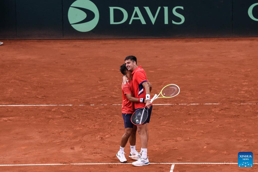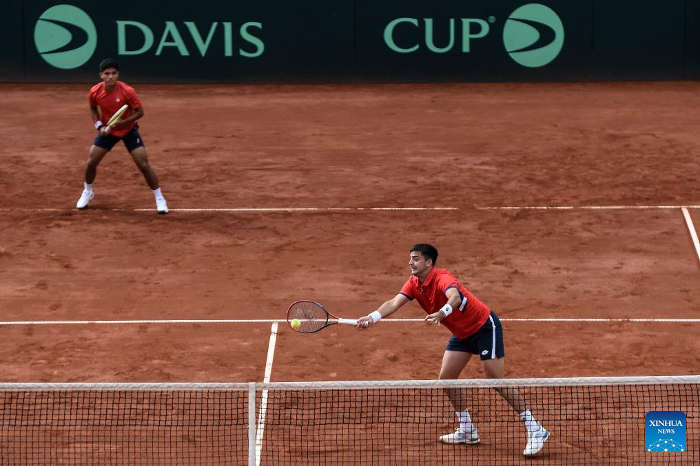 SANTIAGO, 15 septiembre, 2025 (Xinhua) -- Imagen del 14 de septiembre de 2025 de Tomás Barrios Vera (d), de Chile, compitiendo durante el partido de dobles correspondiente a las eliminatorias de la Copa Davis ante Alex Knaff y Raphel Calzi, de Luxemburgo, celebrado en el Court Central Anita Lizana del Estadio Nacional de Chile, en Santiago, capital de Chile. (Xinhua/Jorge Villegas)