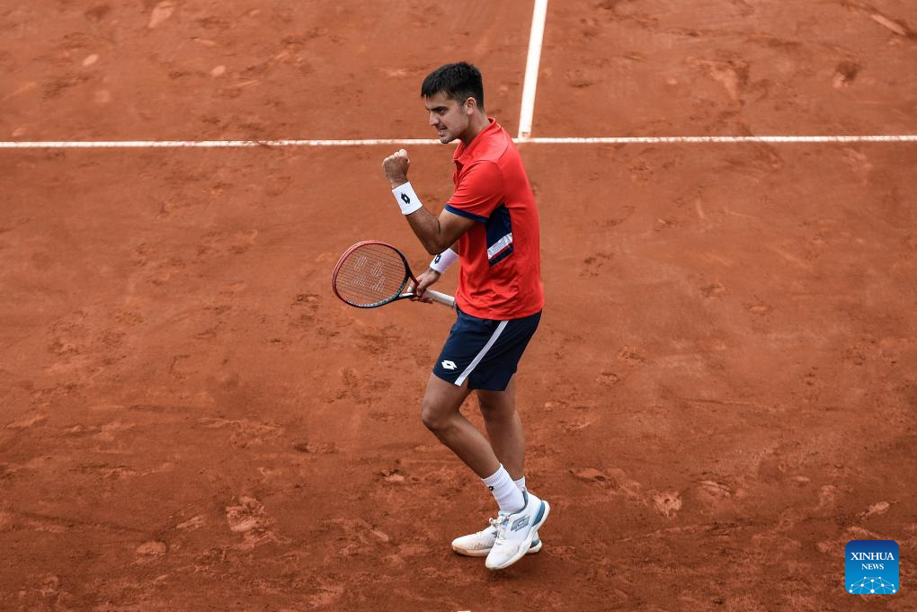 SANTIAGO, 15 septiembre, 2025 (Xinhua) -- Imagen del 14 de septiembre de 2025 de Tomás Barrios Vera, de Chile, reaccionando durante el partido de dobles correspondiente a las eliminatorias de la Copa Davis ante Alex Knaff y Raphel Calzi, de Luxemburgo, celebrado en el Court Central Anita Lizana del Estadio Nacional de Chile, en Santiago, capital de Chile. (Xinhua/Jorge Villegas)