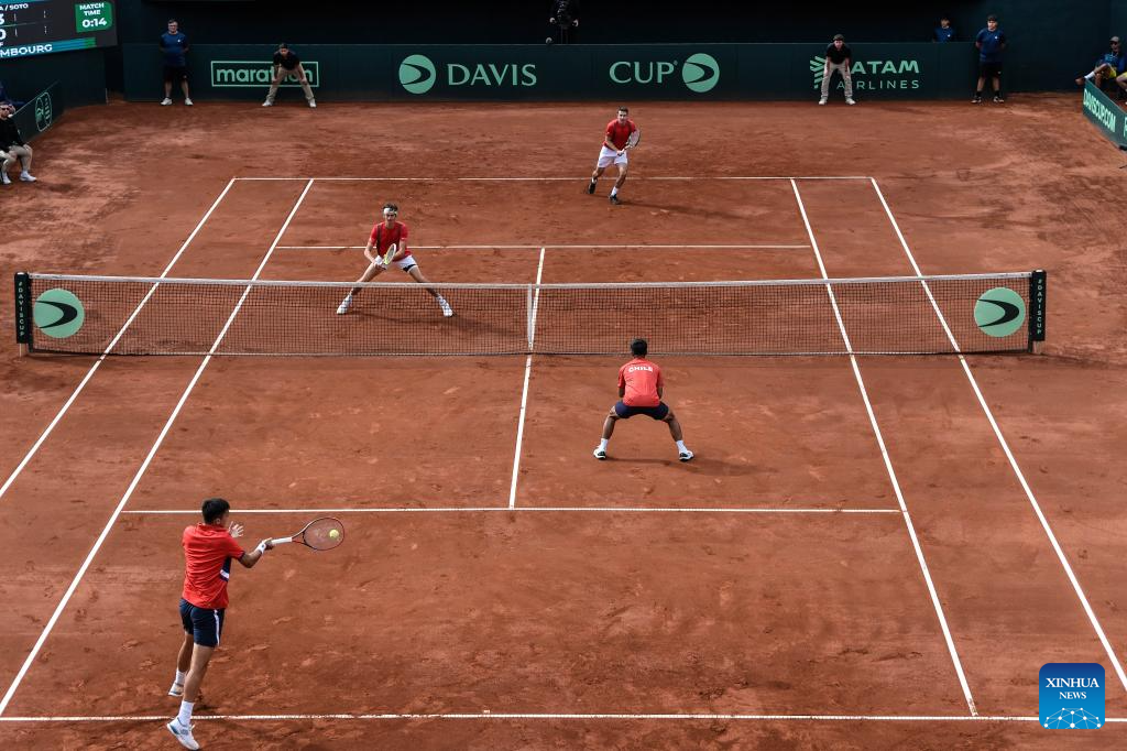 SANTIAGO, 15 septiembre, 2025 (Xinhua) -- Imagen del 14 de septiembre de 2025 de Tomás Barrios Vera (i-abajo), de Chile, compitiendo durante el partido de dobles correspondiente a las eliminatorias de la Copa Davis ante Alex Knaff y Raphel Calzi, de Luxemburgo, celebrado en el Court Central Anita Lizana del Estadio Nacional de Chile, en Santiago, capital de Chile. (Xinhua/Jorge Villegas)