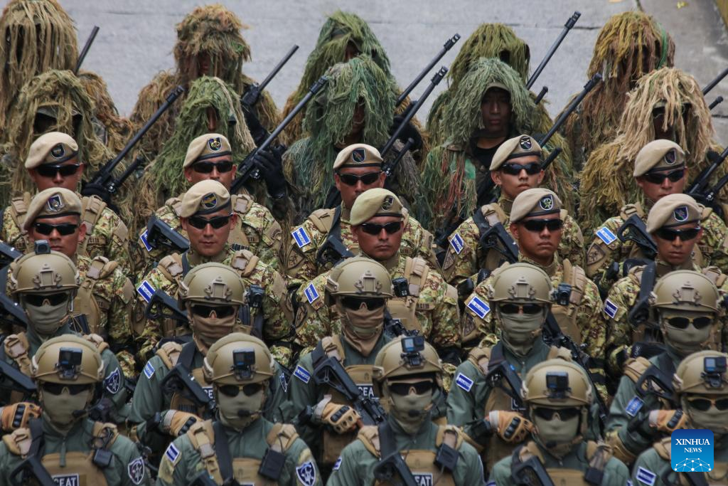 SAN SALVADOR, 15 septiembre, 2025 (Xinhua) -- Soldados del Comando Especial Antiterrorista de El Salvador marchan durante el desfile por la celebración del 204 aniversario del Día de Independencia de El Salvador, en el departamento de San Salvador, capital de El Salvador, el 15 de septiembre de 2025. Miles de salvadoreños colmaron el lunes las calles de San Salvador, la capital, para conmemorar los 204 años de independencia de Centroamérica de España, en un desfile cívico militar que, pese a las lluvias nocturnas, inició puntualmente a las 8:00 hora local con un ambiente de música, color y orgullo nacional.(Xinhua/Alexander Peña)