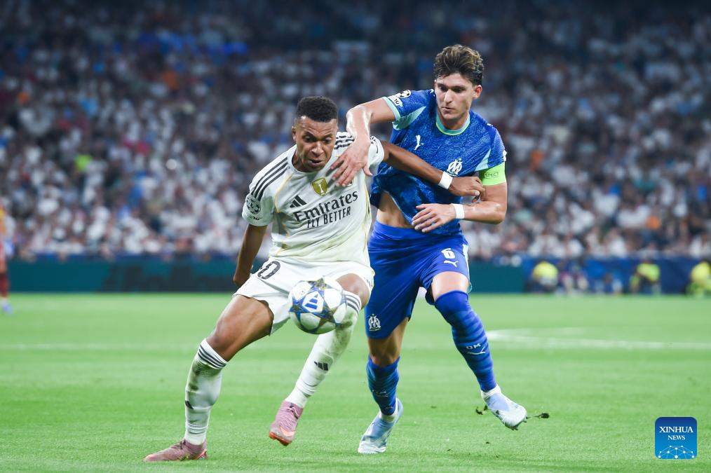 MADRID, 17 septiembre, 2025 (Xinhua) -- Imagen del 16 de septiembre de 2025 de Kylian Mbappe (i), de Real Madrid, disputando el balón con Leonardo Balerdi, de Olympique Marseille, durante el partido de la primera ronda de la Liga de Campeones de la UEFA, entre Real Madrid y Olympique Marseille, en Madrid, España. (Xinhua/Gustavo Valiente)