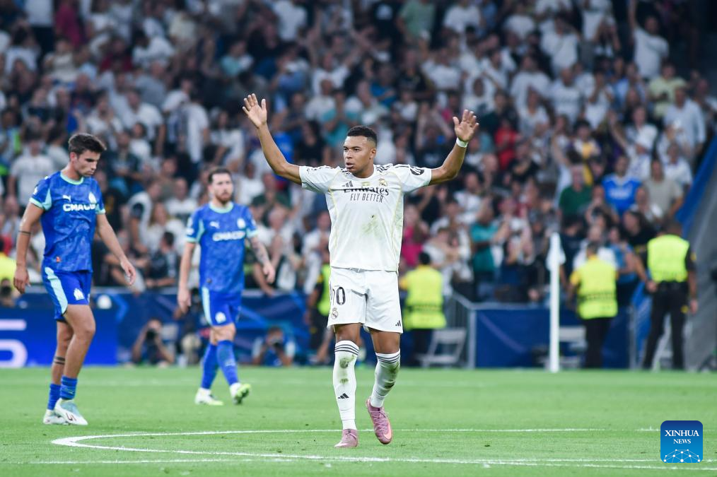 MADRID, 17 septiembre, 2025 (Xinhua) -- Imagen del 16 de septiembre de 2025 de Kylian Mbappe, de Real Madrid, festejando su anotación durante el partido de la primera ronda de la Liga de Campeones de la UEFA, entre Real Madrid y Olympique Marseille, en Madrid, España. (Xinhua/Gustavo Valiente)