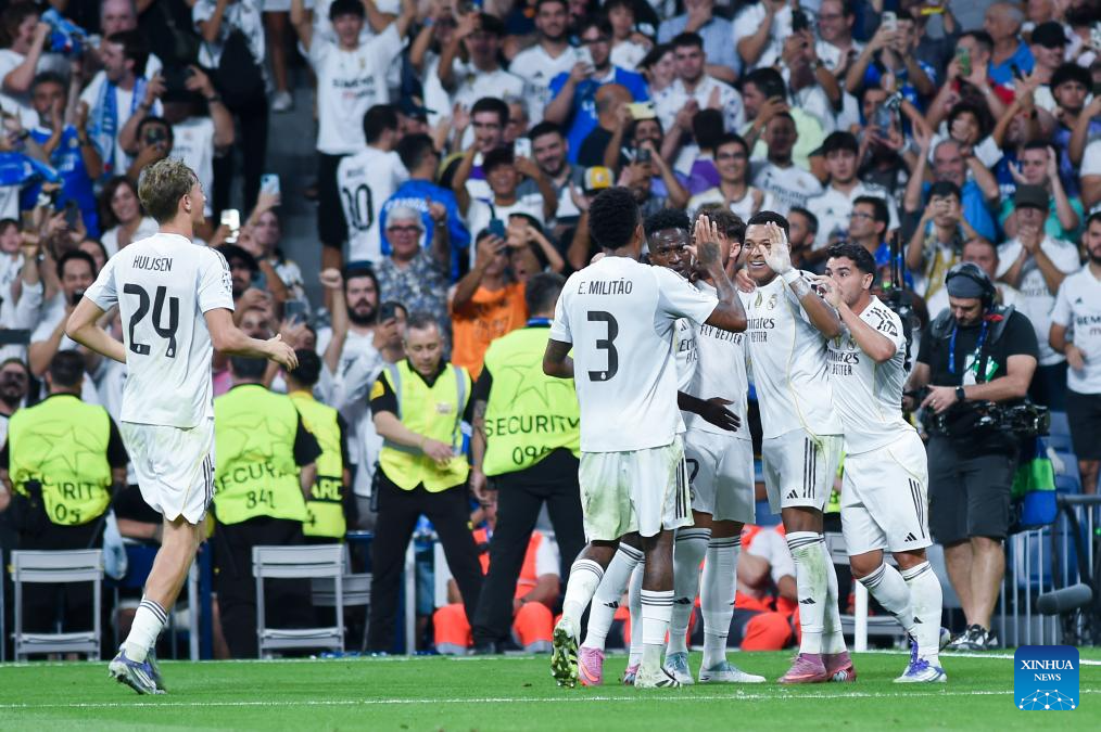 MADRID, 17 septiembre, 2025 (Xinhua) -- Imagen del 16 de septiembre de 2025 de los jugadores de Real Madrid festejando una anotación durante el partido de la primera ronda de la Liga de Campeones de la UEFA, entre Real Madrid y Olympique Marseille, en Madrid, España. (Xinhua/Gustavo Valiente)