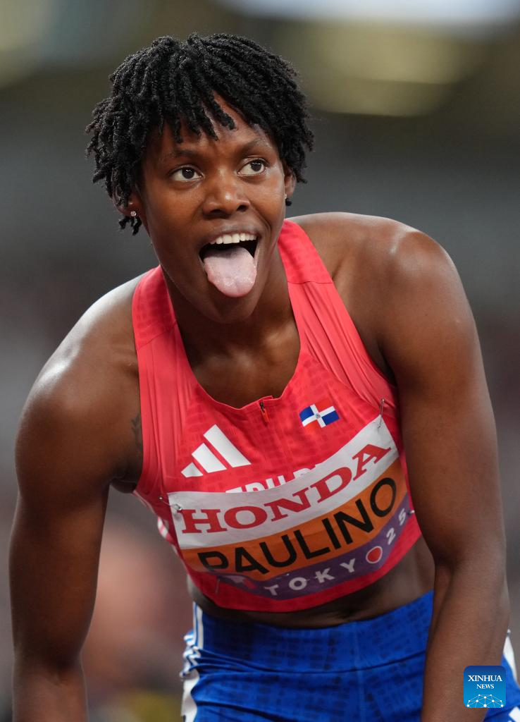 TOKIO, 17 septiembre, 2025 (Xinhua) -- Imagen del 16 de septiembre de 2025 de Marileidy Paulino, de República Dominicana, reaccionando al término de la semifinal de 400m femeninos, en el Campeonato Mundial de Atletismo de 2025, en Tokio, Japón. (Xinhua/Ju Huanzong)