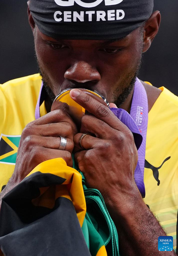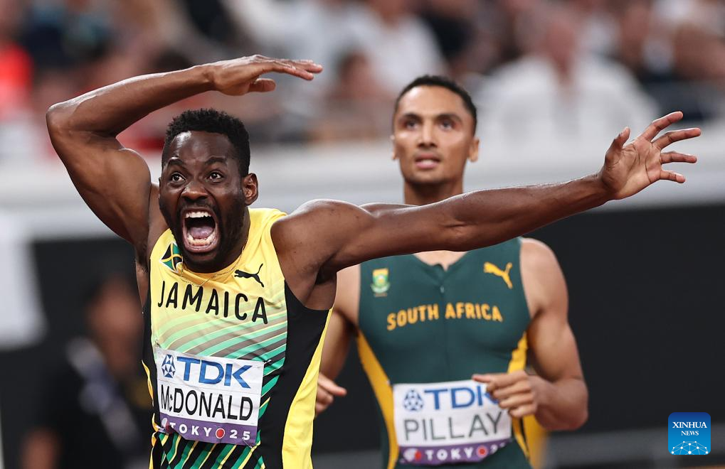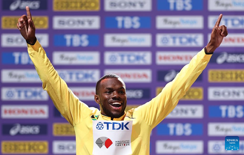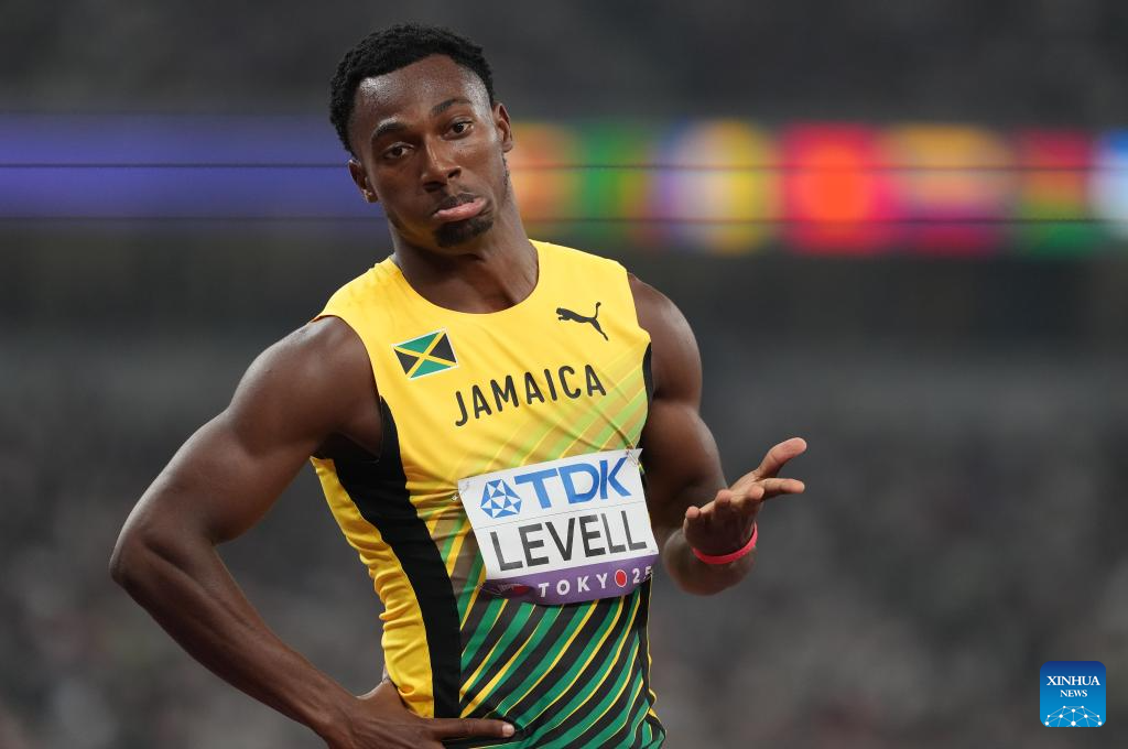 TOKIO, 17 septiembre, 2025 (Xinhua) -- Bryan Levell, de Jamaica, es visto al término de las eliminatorias de 200m masculinos, en el Campeonato Mundial de Atletismo de 2025, en Tokio, Japón, el 17 de septiembre de 2025. (Xinhua/Jiang Han)