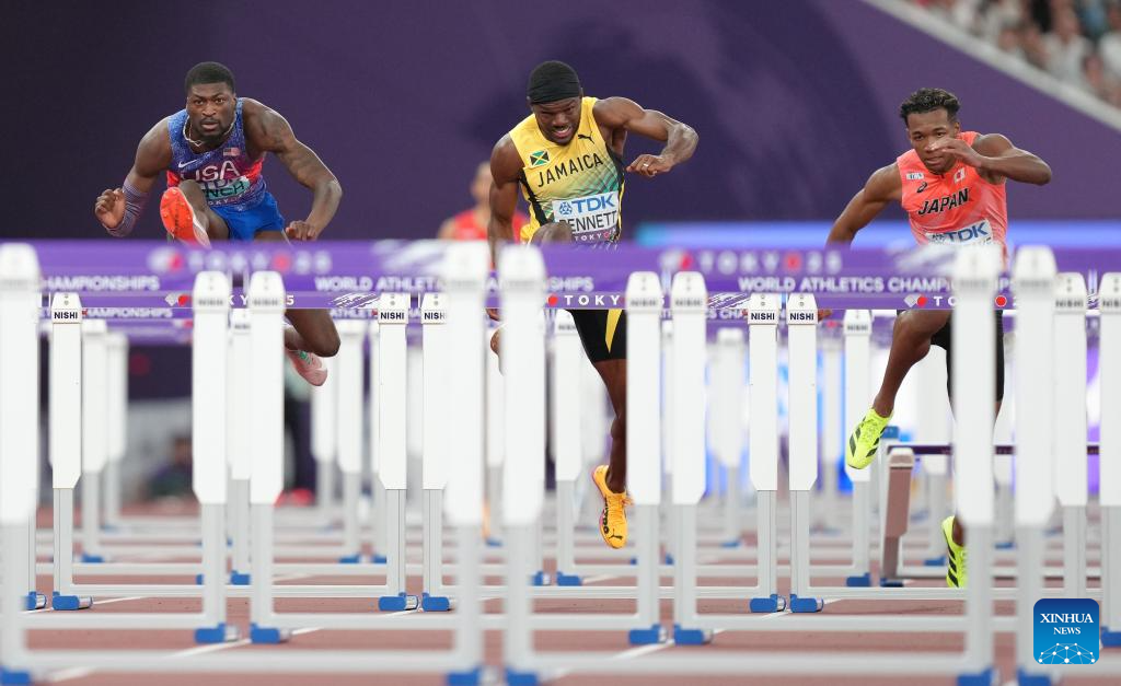 TOKIO, 17 septiembre, 2025 (Xinhua) -- Imagen del 16 de septiembre de 2025 de Cordell Tinch (i), de Estados Unidos, y Orlando Bennett (c), de Jamaica, compitiendo en la final de 110m con vallas masculinos, en el Campeonato Mundial de Atletismo de 2025, en Tokio, Japón. (Xinhua/Ju Huanzong)