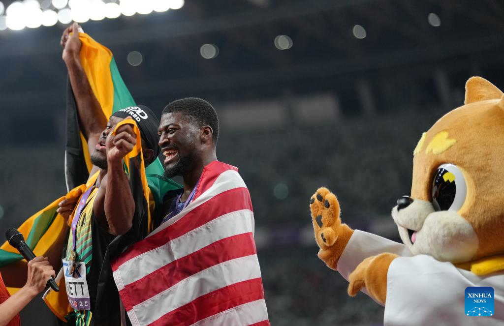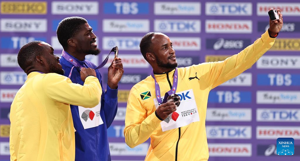 TOKIO, 17 septiembre, 2025 (Xinhua) -- El medallista de plata, Orlando Bennett (i), de Jamaica, es visto durante la ceremonia de premiación de 110m con vallas masculinos, en el Campeonato Mundial de Atletismo de 2025, en Tokio, Japón, el 17 de septiembre de 2025. (Xinhua/Jia Haocheng)