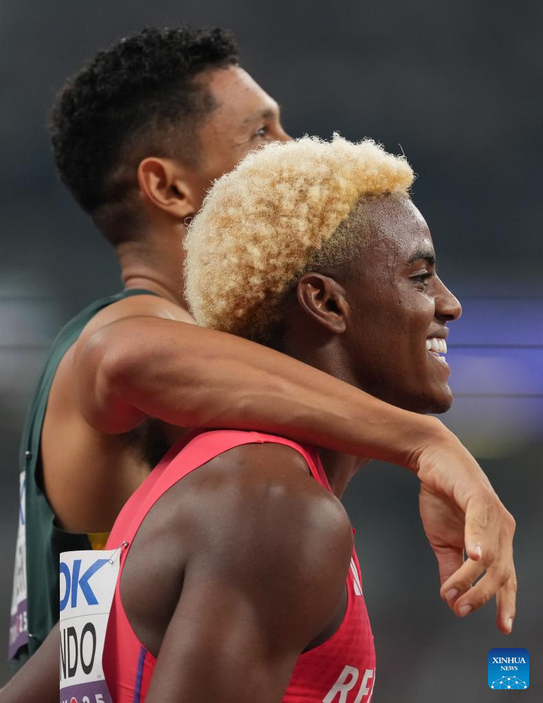 TOKIO, 17 septiembre, 2025 (Xinhua) -- Alexander Ogando (i), de República Dominicana, y Wayde Van Niekerk, de Sudáfrica, son vistos al término de las eliminatorias de 200m masculinos, en el Campeonato Mundial de Atletismo de 2025, en Tokio, Japón, el 17 de septiembre de 2025. (Xinhua/Jiang Han)
